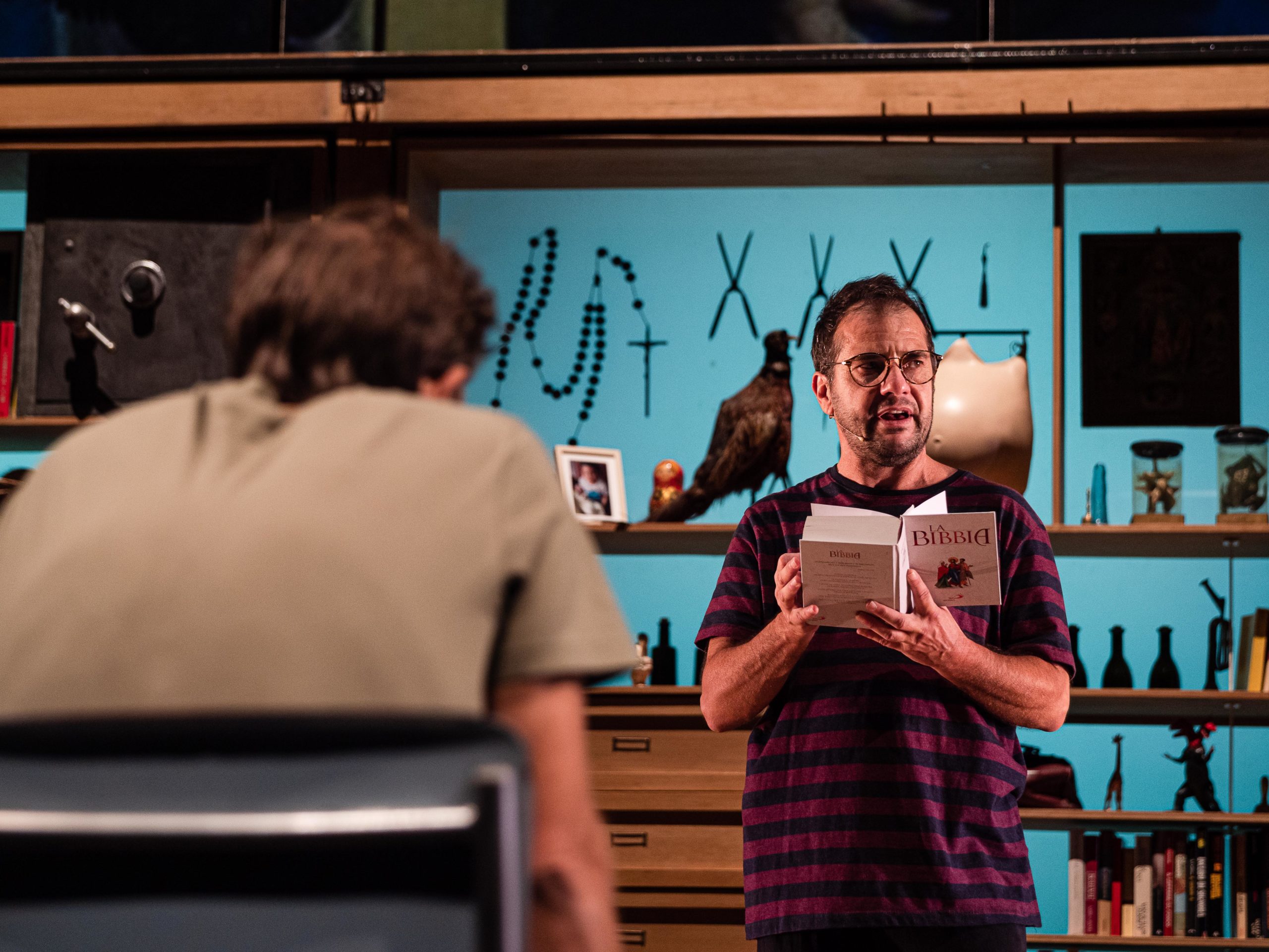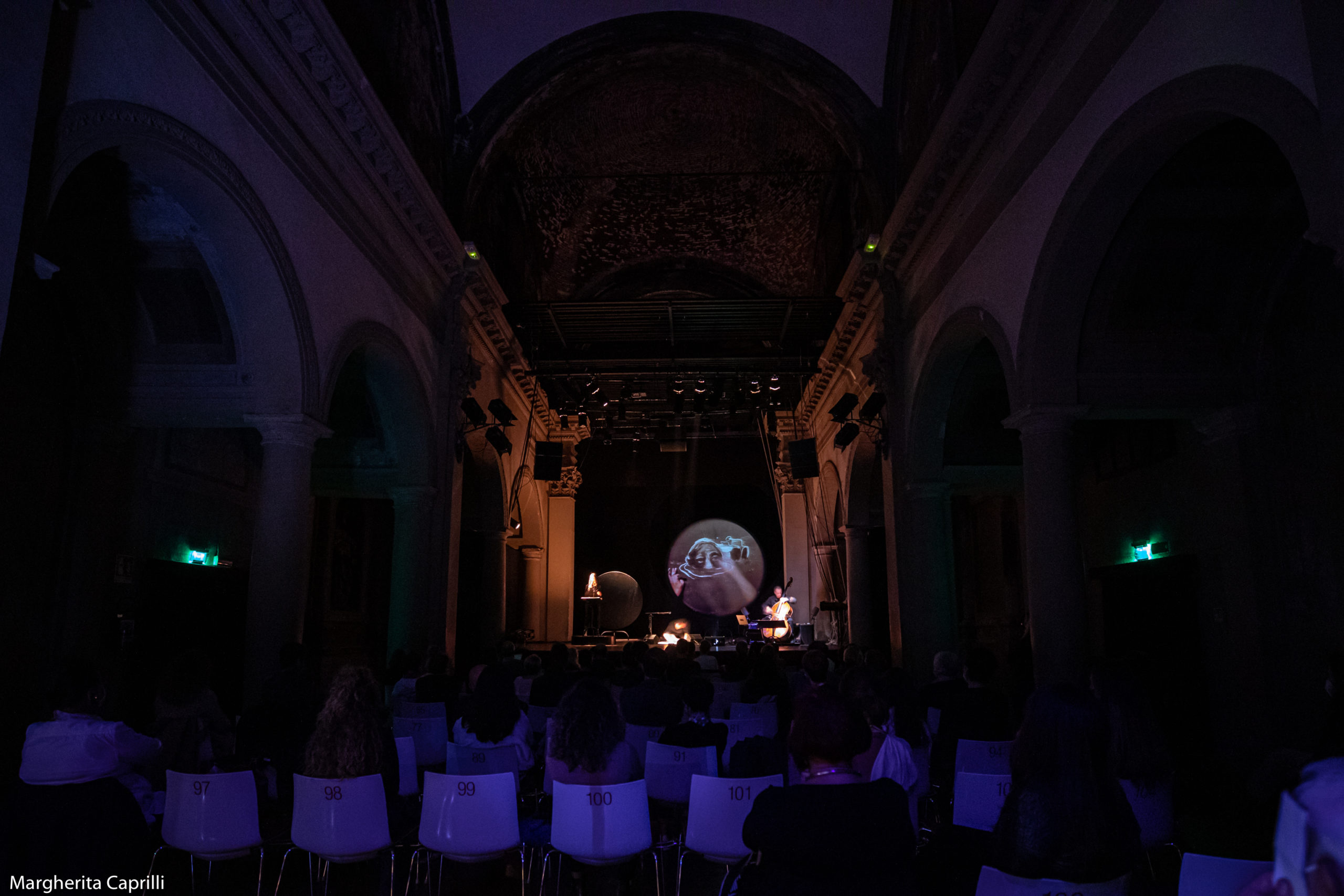 Il teatro San Leonardo è all’interno di una chiesa, la volta scrostata ricorda un cielo stellato disegnato; questo luogo sembra accentuare la dimensione rituale del teatro, il pubblico entrando in sala abbassa la voce nell’attesa del gesto artistico.