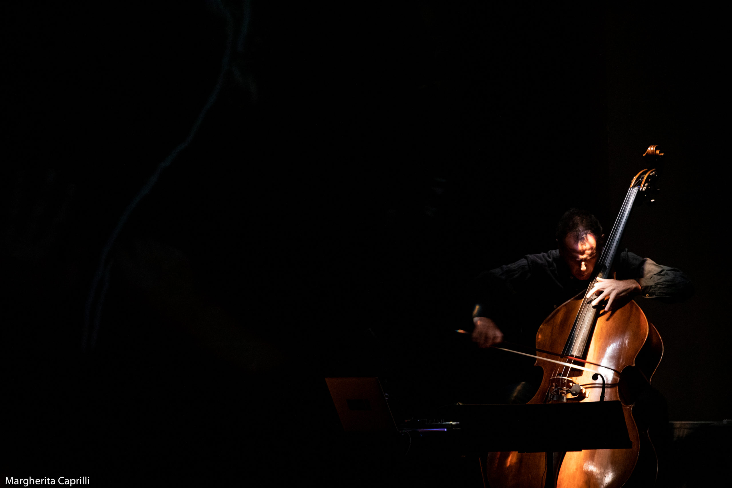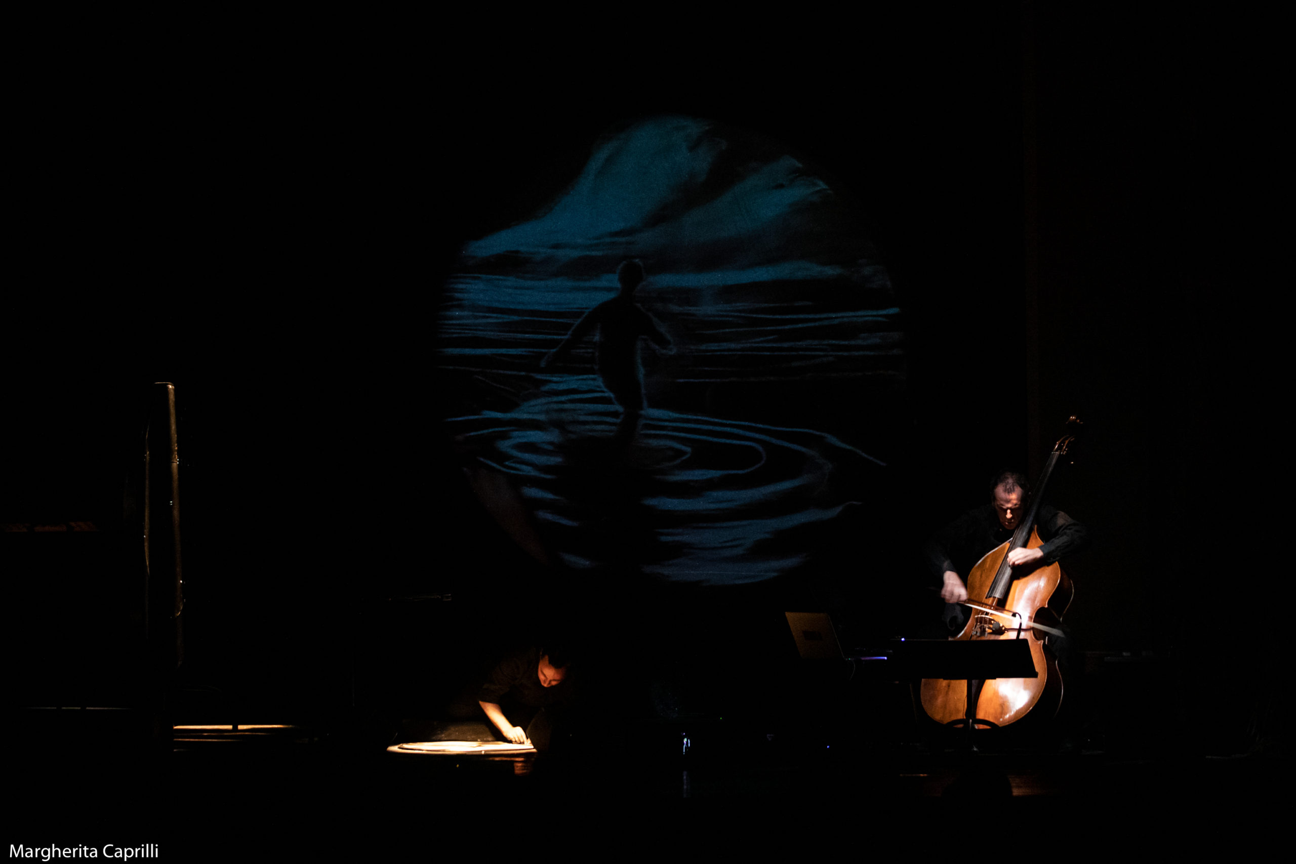 Rimbombano i tacchi di scarpe maschili, ultimi spettatori a entrare, mentre due giovani innamorati provano a confondersi nel leggero brusio rimasto e si sfiorano le mani. Senza nessun segnale scende il silenzio e poi il buio. Montanari, Ricci e Roccato cominciano, in questa quiete, un’azione sfumata e tesa.