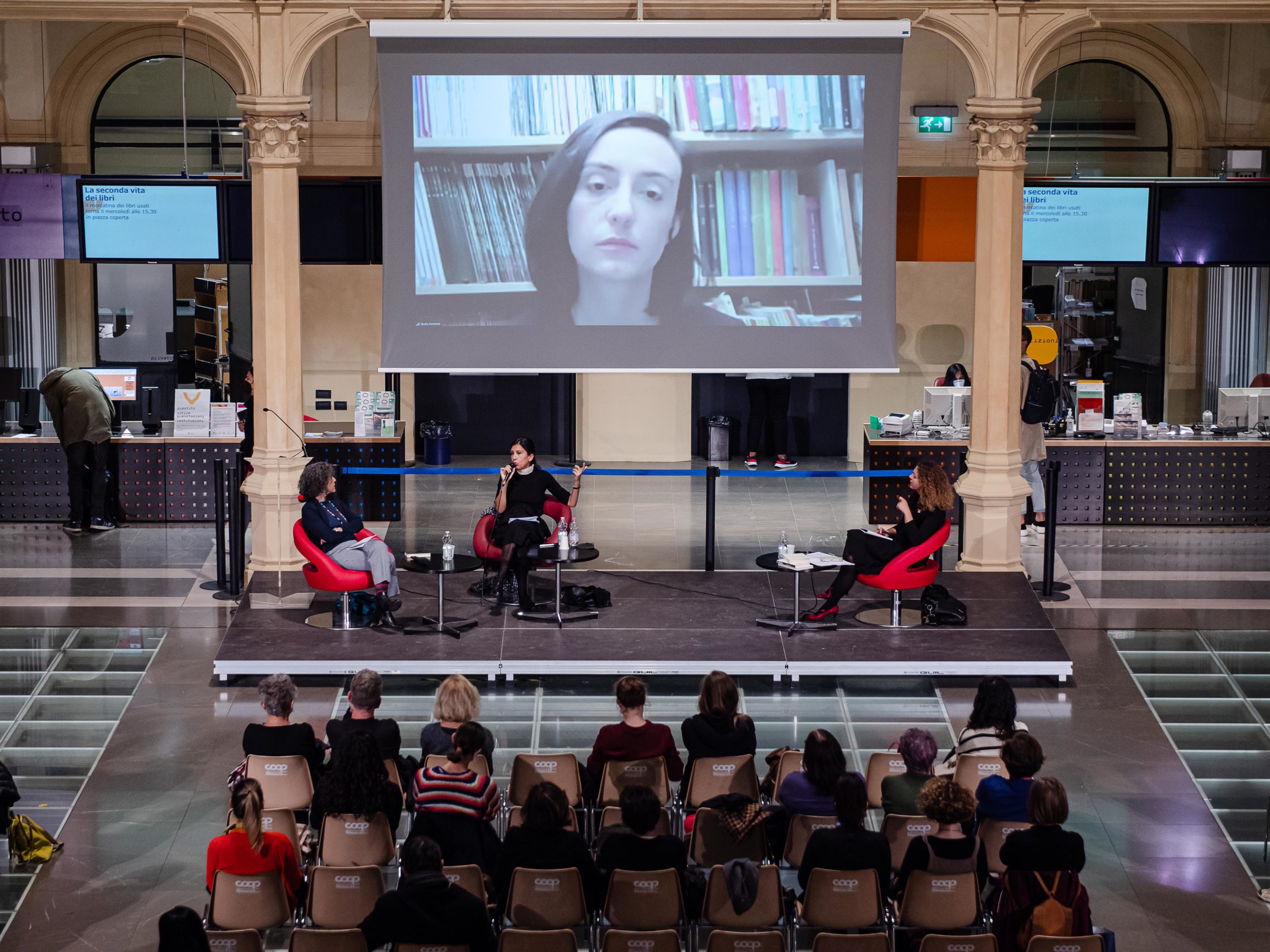 La Biblioteca Salaborsa sembra una piazza coperta, la sua architettura rimanda a un’arena pubblica, a un luogo di scambio. è qui che avviene l’incontro di tre scrittrici: Giulia Caminito, Maria Grazia Calandrone, Gaia Manzini insieme alla ricercatrice Valentina Greco.