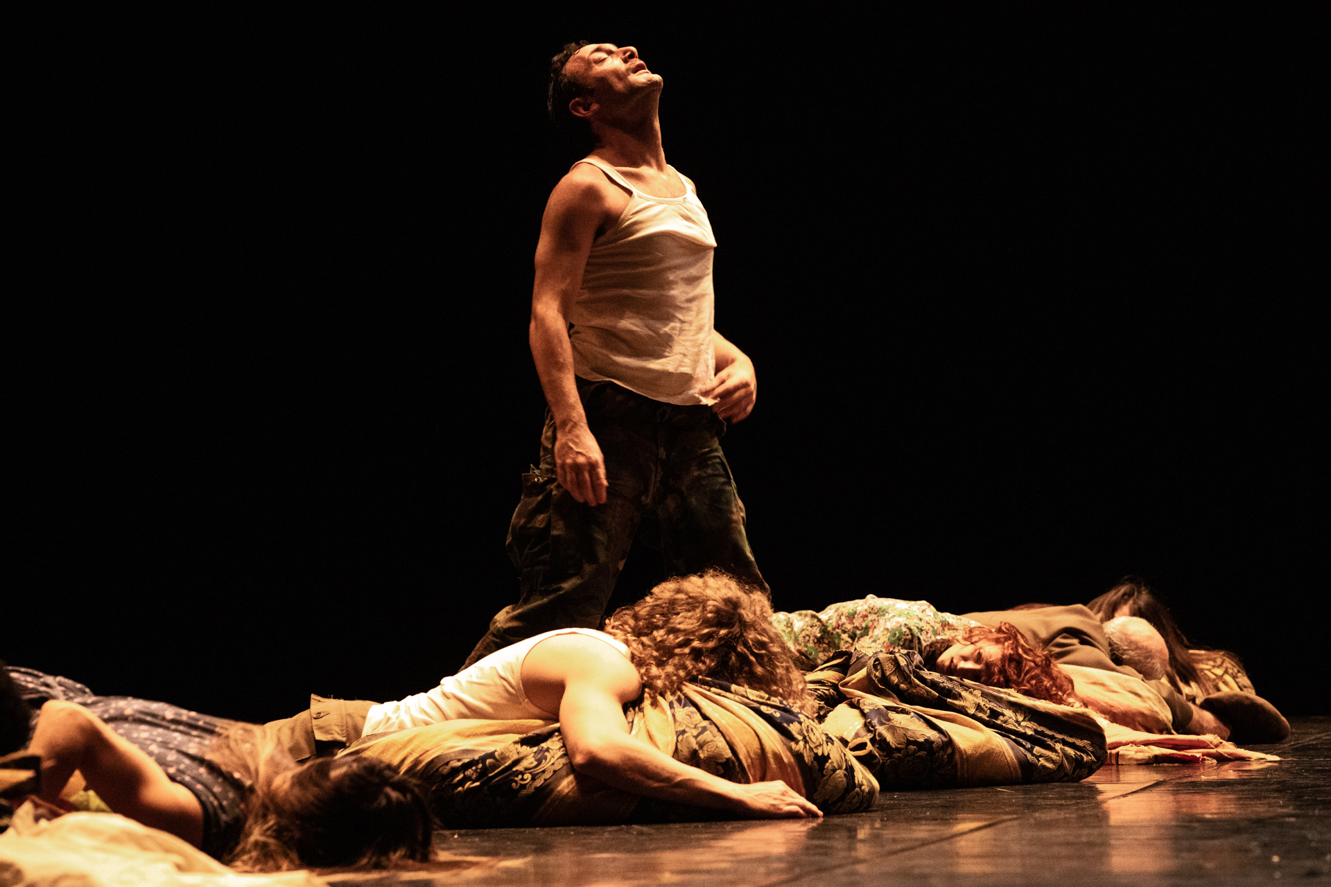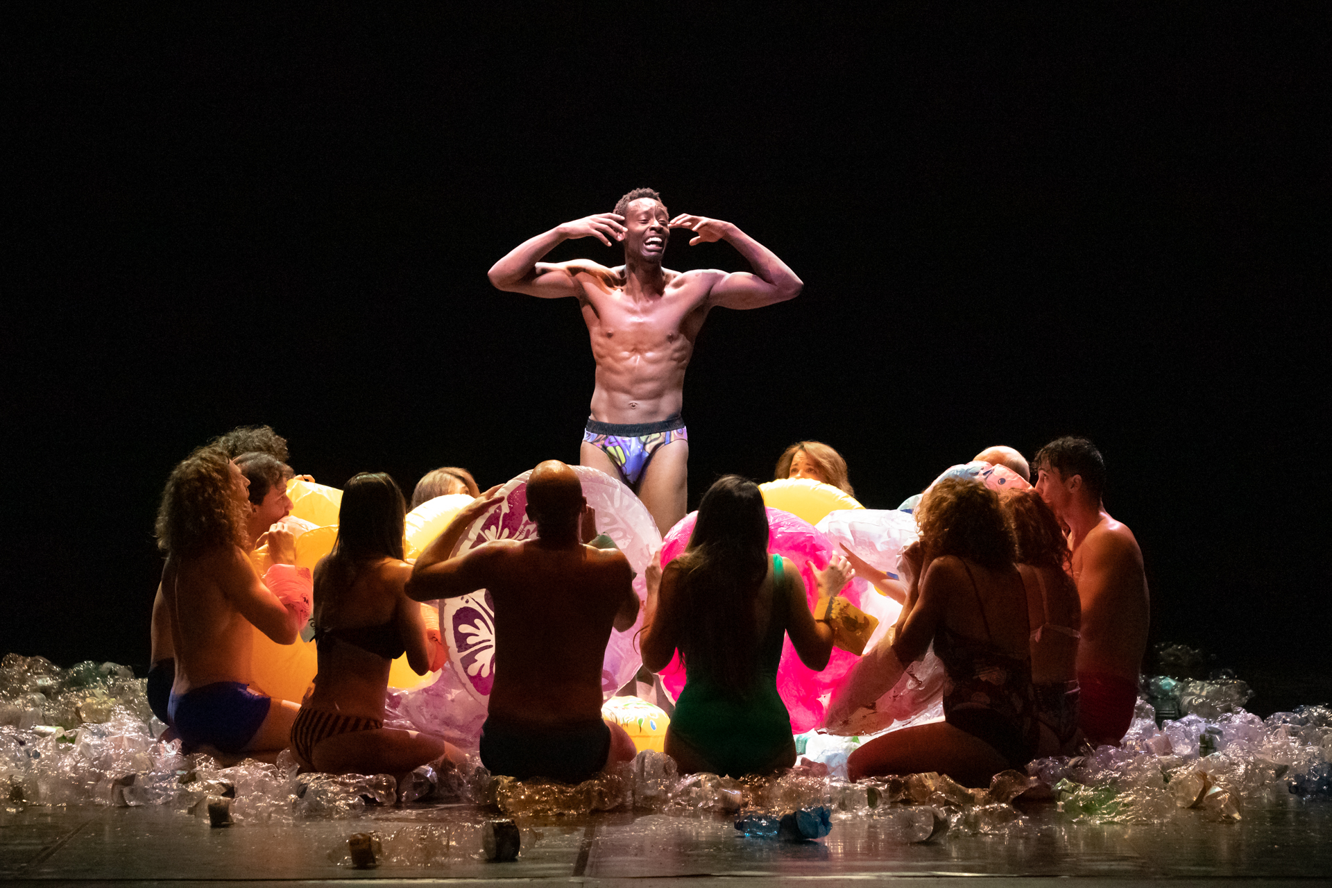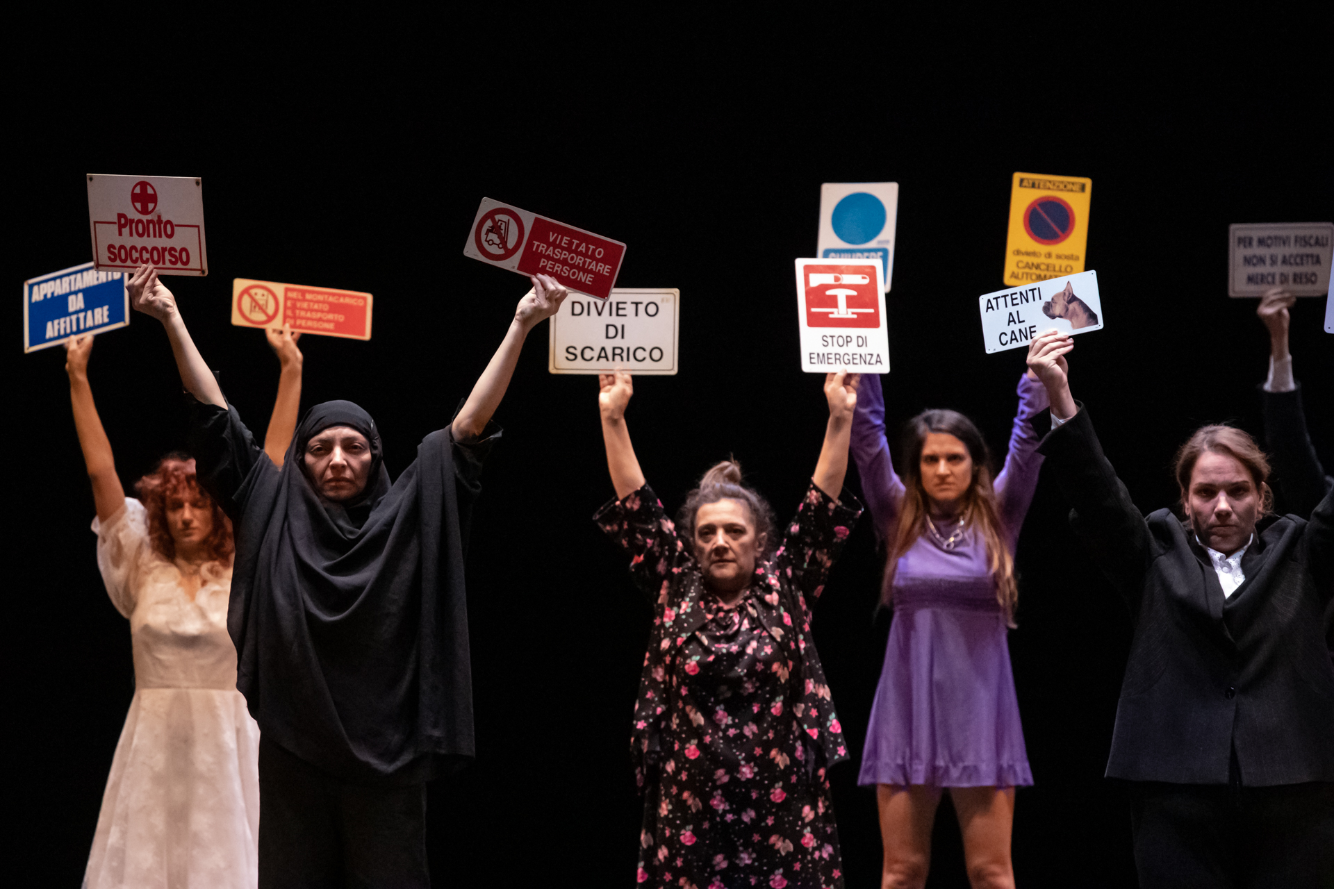 Extra moenia, che in latino significa “fuori dalle mura” è una ballata allegorica che racconta i momenti di una giornata qualunque di una comunità, tra eventi quotidiani ed eccezionali. Nella creazione di Emma Dante ci sono un ferroviere, una donna ucraina in fuga, un migrante congolese, un militare che esalta la guerra, due innamorati divisi dal timore di scegliere, una famiglia religiosa, una donna iraniana, due calciatori del Palermo. Tutti si ritrovano per strada, fuori dalle proprie abitazioni, per vivere insieme le meraviglie e le miserie della vita. Senza trama lineare, la pièce è un susseguirsi di episodi di quotidianità e di tragedia: uno stupro, un mercato, un elenco di divieti, un attentato, un naufragio. «Alla fine – commenta la regista – questa comunità è immersa in un mare di plastica dove, dolcemente, si lascia andare alla deriva. Le relazioni, gli incontri, le frustrazioni e i fallimenti sono alcuni dei tasselli del frenetico mosaico di questa giornata. Dall’alba al tramonto tutti e tutte camminano insieme, nella stessa direzione. Il cammino è l’unico modo per liberarsi del proprio fardello in un rituale condiviso, liberatorio e potente».
