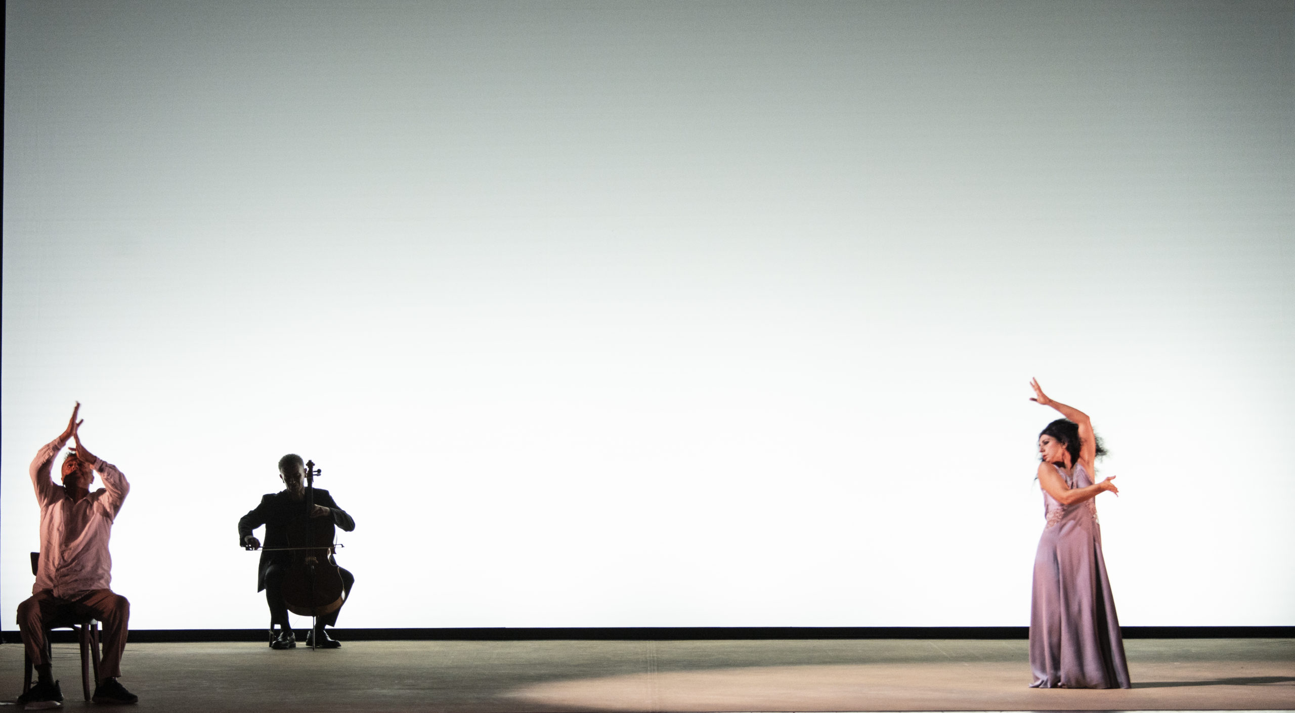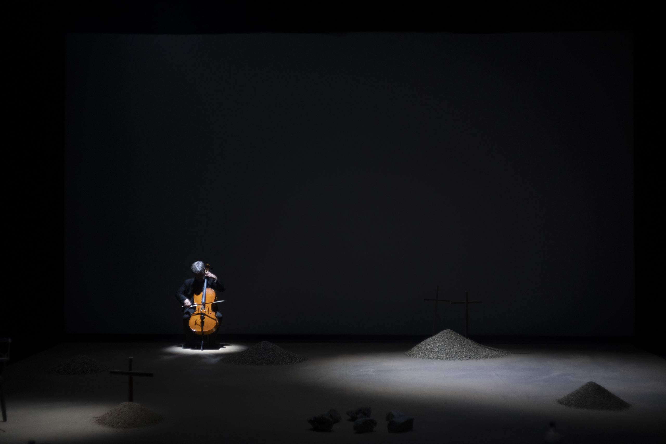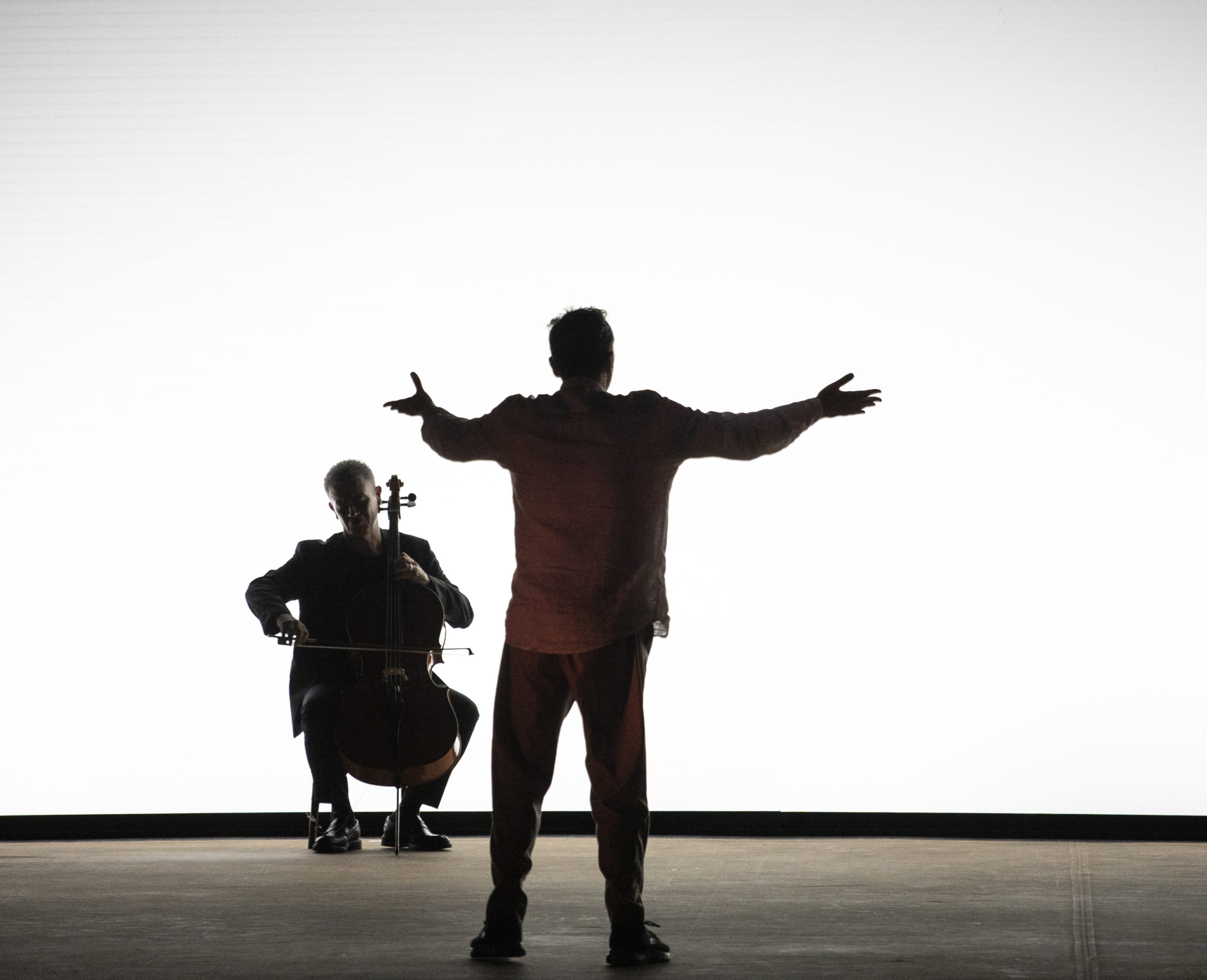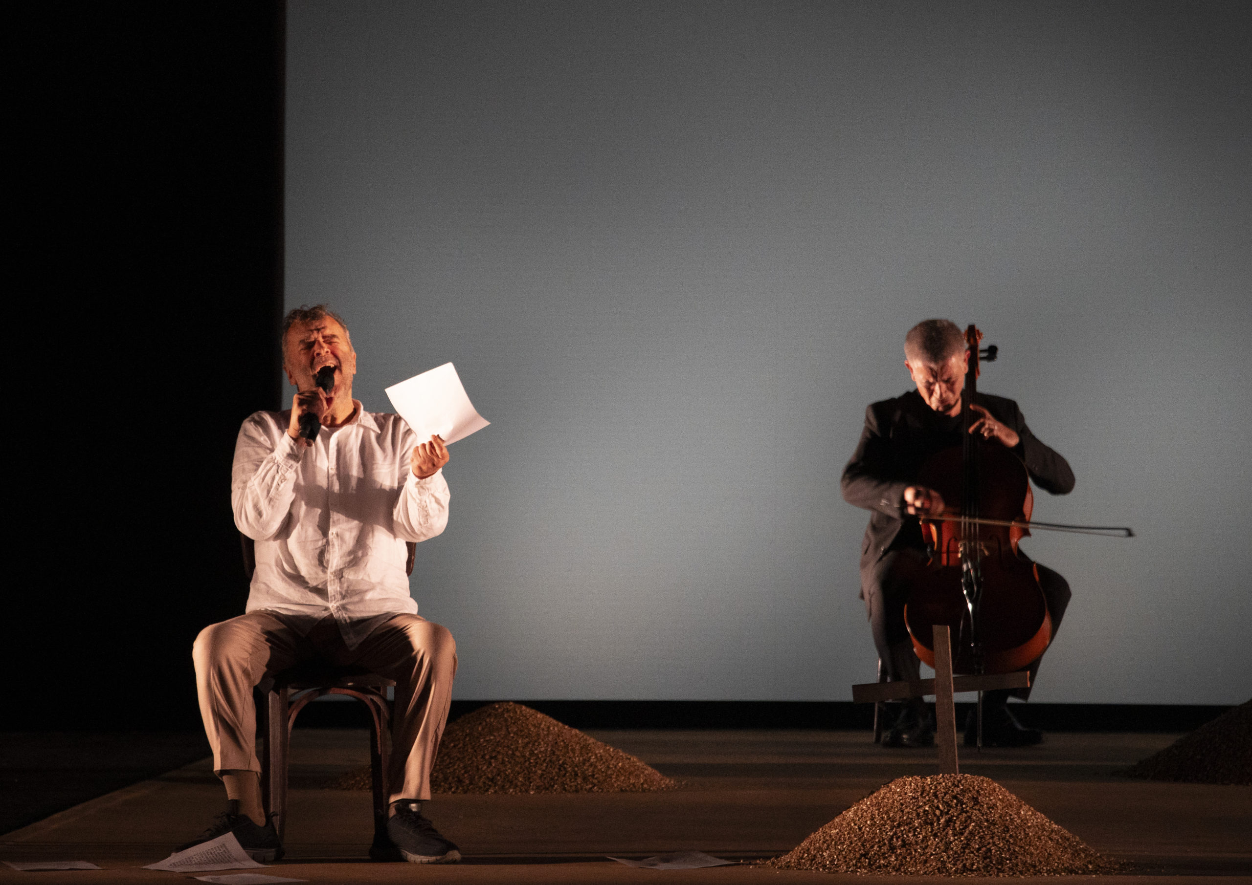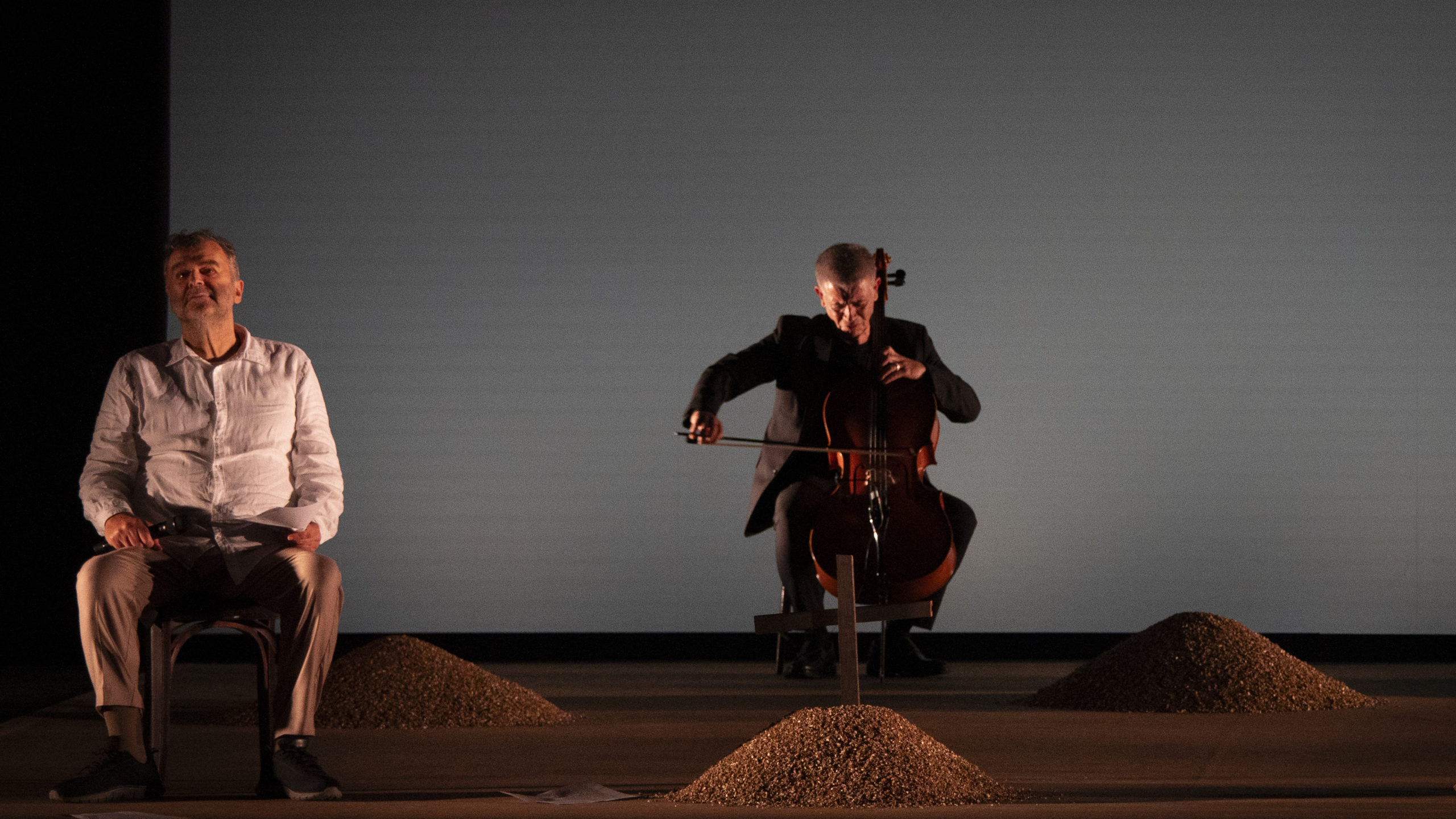 Tutto il teatro di Pippo Delbono nasce dalla musica e segue la partitura di un ritmo interiore. Il suo stile di composizione, ancora una volta, è musicale. Note che suonano lamenti di amore e tenerezza trascinano gli attori della Compagnia in una danza, un rito sacro, un funerale forse. Sulle note del virtuoso violoncellista Giovanni Ricciardi, in scena con il suo strumento, e su brani che provengono dalla memoria degli anni Settanta, Delbono si ripete: “Devi danzare nella guerra, nella tua guerra”.