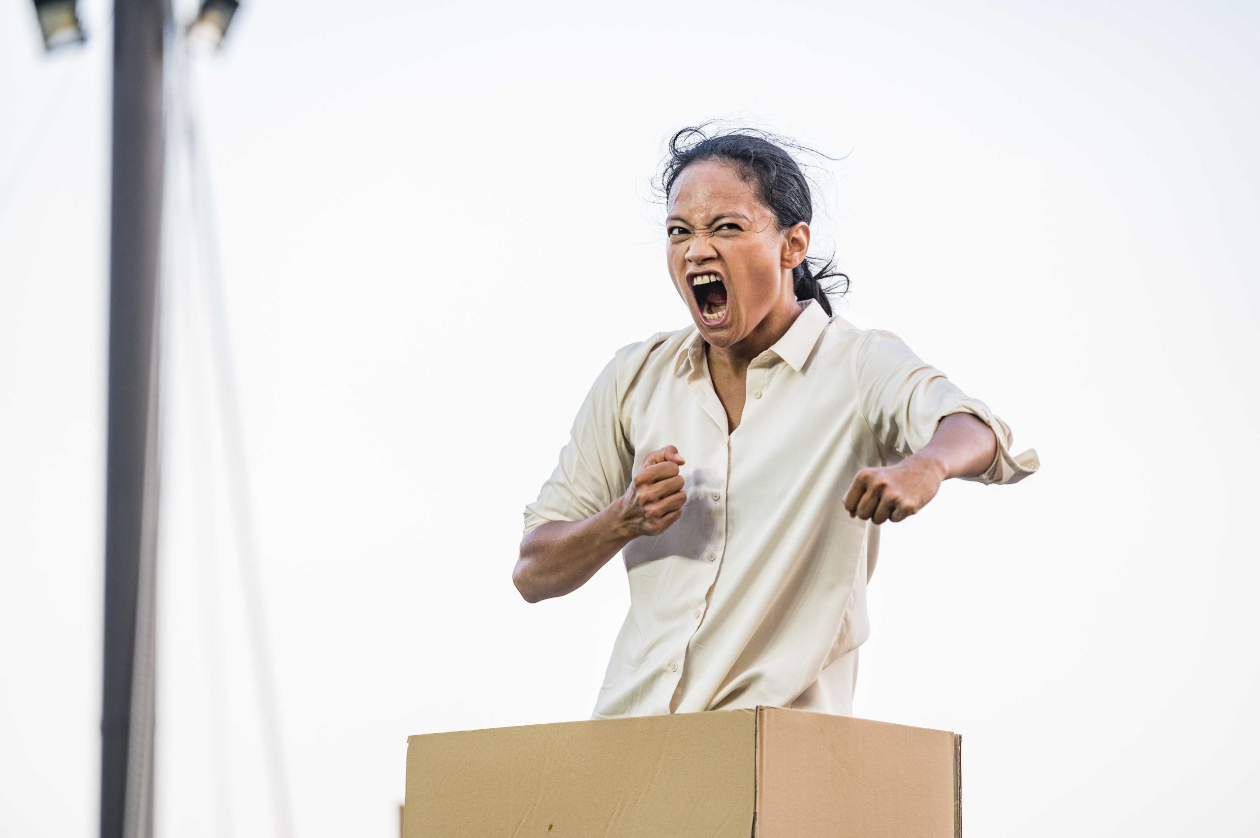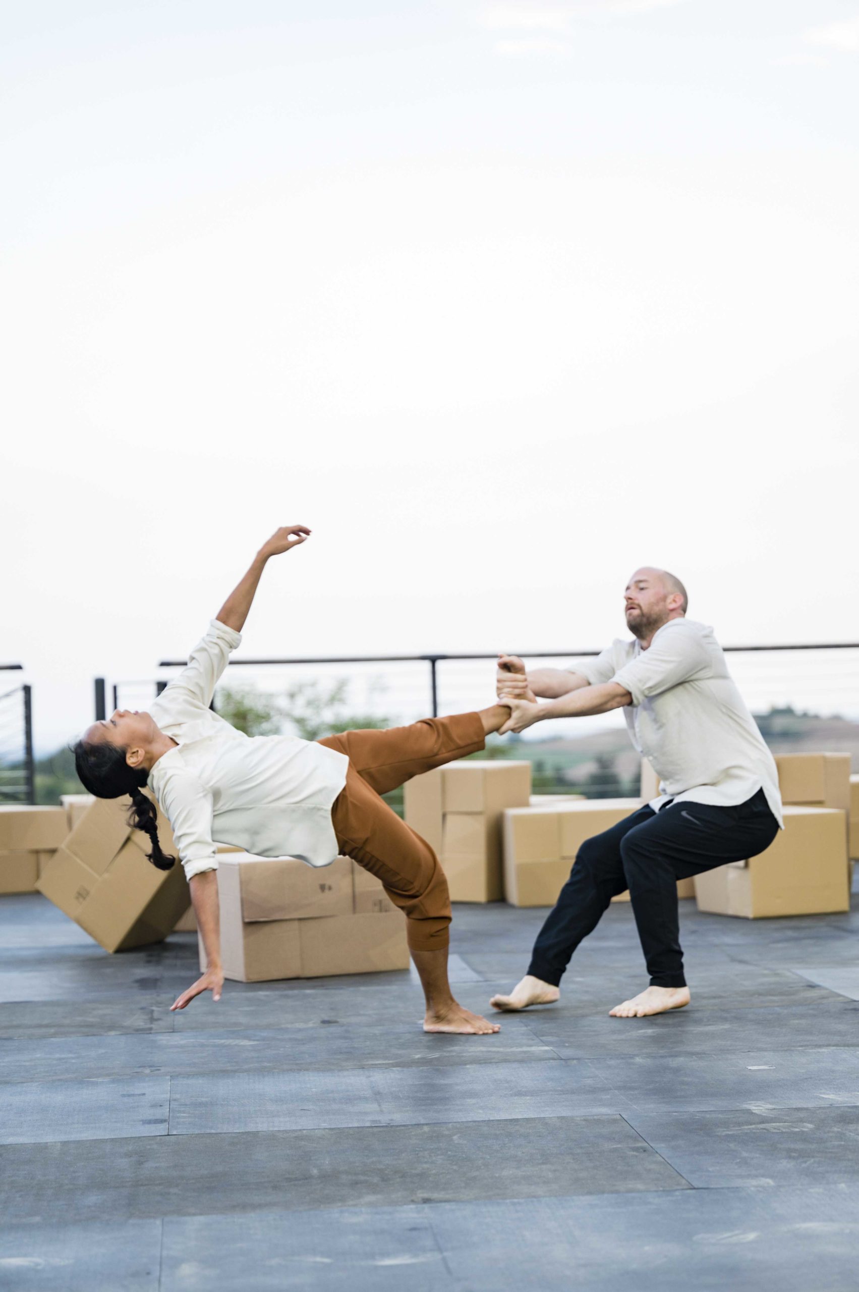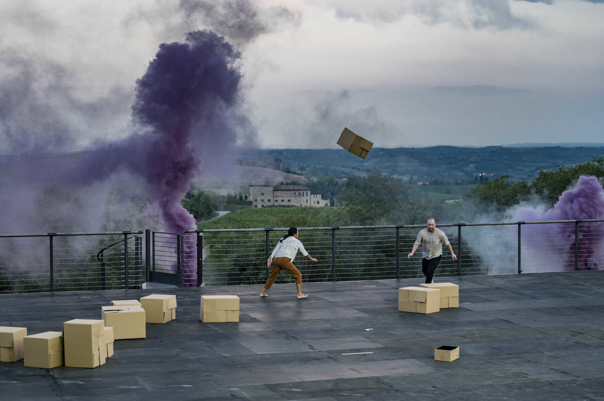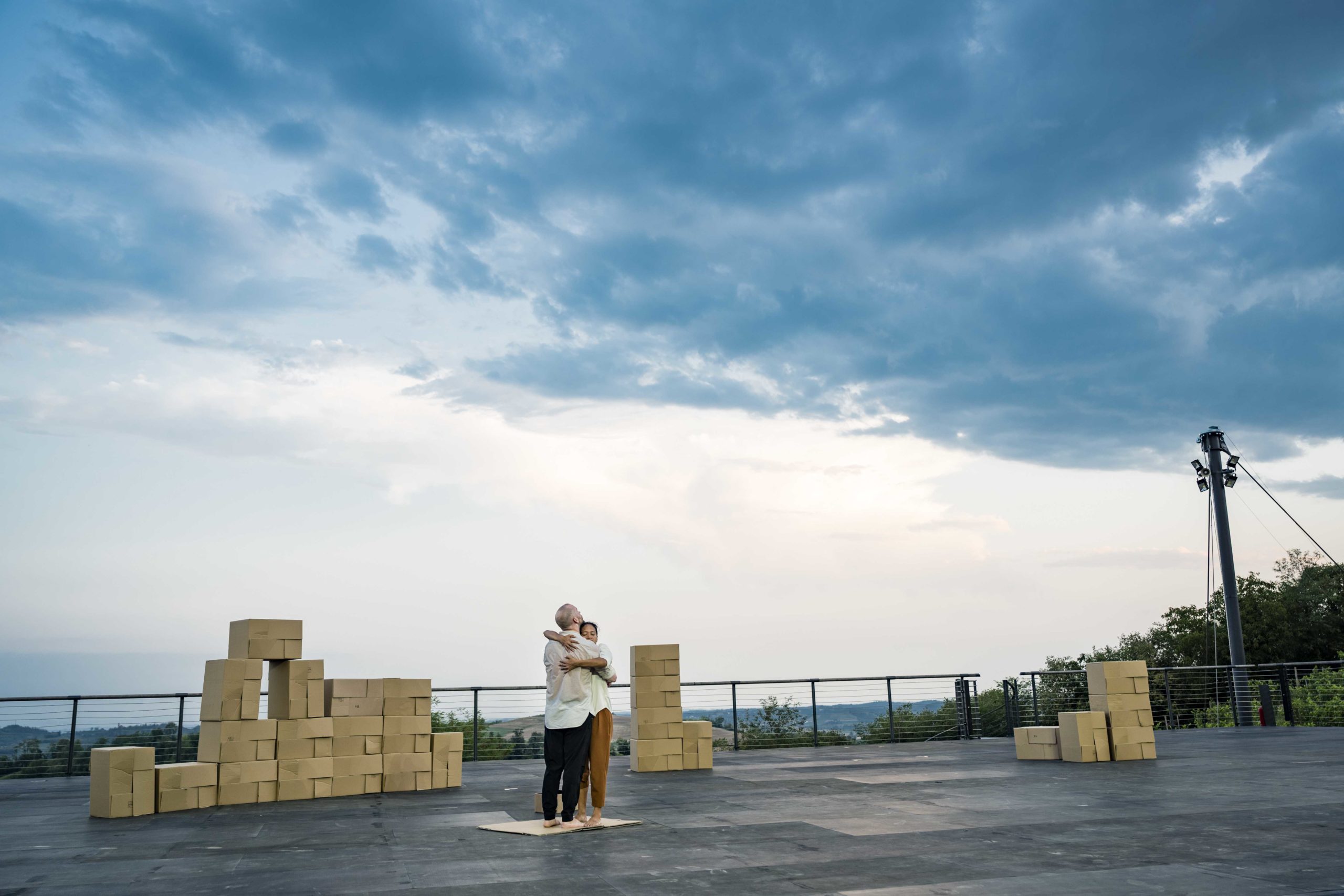 Attorno a loro, torri di scatole di cartone: un ordine da costruire a tutti i costi mentre il caos preme per esprimersi facendo precipitare la scena e sussultare i cuori.